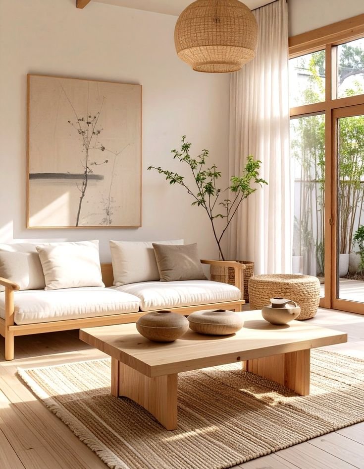 Ảnh minh hoạ – Nội thất Japandi tối giản với trọng tâm thấp và đường nét sạch sẽ.