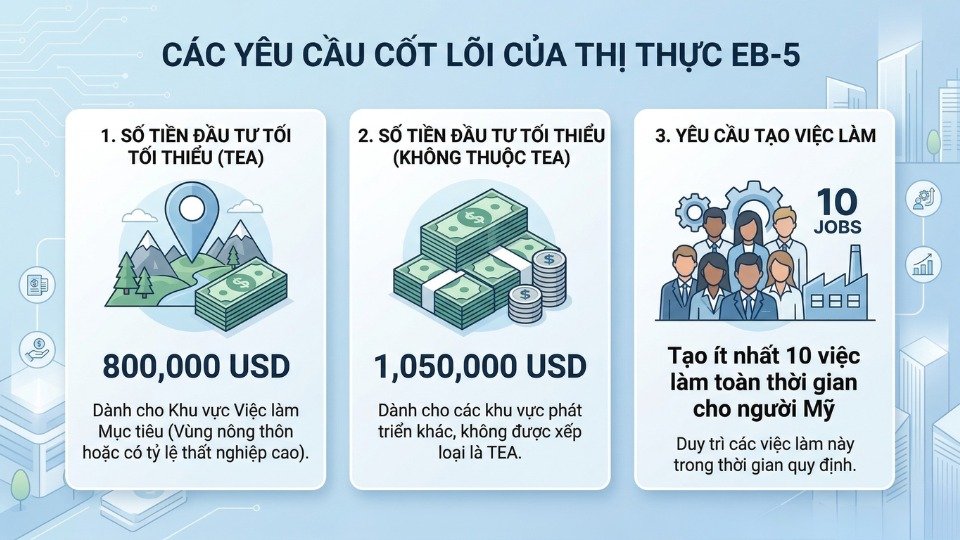 Bên cạnh yêu cầu về vốn, mỗi khoản đầu tư EB-5 phải hướng đến mục tiêu tạo tối thiểu 10 việc làm toàn thời gian cho lao động Mỹ đủ điều kiện, trong khung thời gian luật định, thông qua mô hình đầu tư trực tiếp hoặc qua Trung tâm Vùng[2], [3]. Đây là điều kiện nền tảng để hồ sơ tiến đến giai đoạn gỡ điều kiện thẻ xanh.