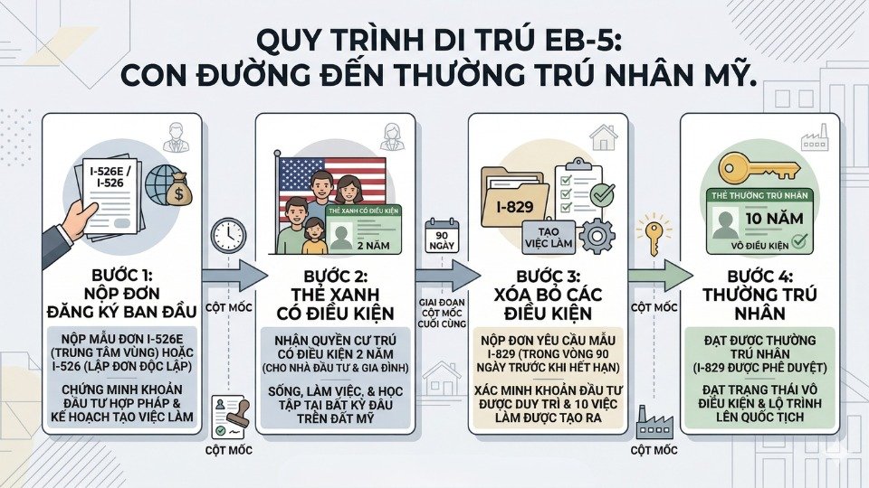Hành trình EB-5 có thể được chia thành ba giai đoạn chính, kéo dài trong nhiều năm[1], [3]. Về biểu mẫu, nhà đầu tư qua Trung tâm Vùng dùng mẫu I-526E, còn hồ sơ EB-5 trực tiếp (standalone/direct) dùng mẫu I-526[4], [5].