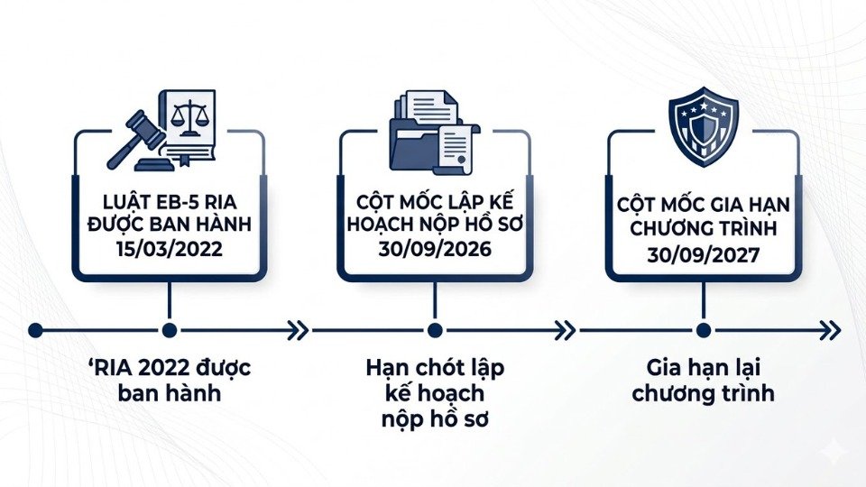 Đạo luật Cải cách và Liêm chính EB-5 (RIA) ban hành năm 2022 tạo ra nhiều thay đổi nền tảng cho chương trình EB-5, đồng thời đặt ra các mốc thời gian quan trọng nhà đầu tư cần theo dõi sát[3], [9].